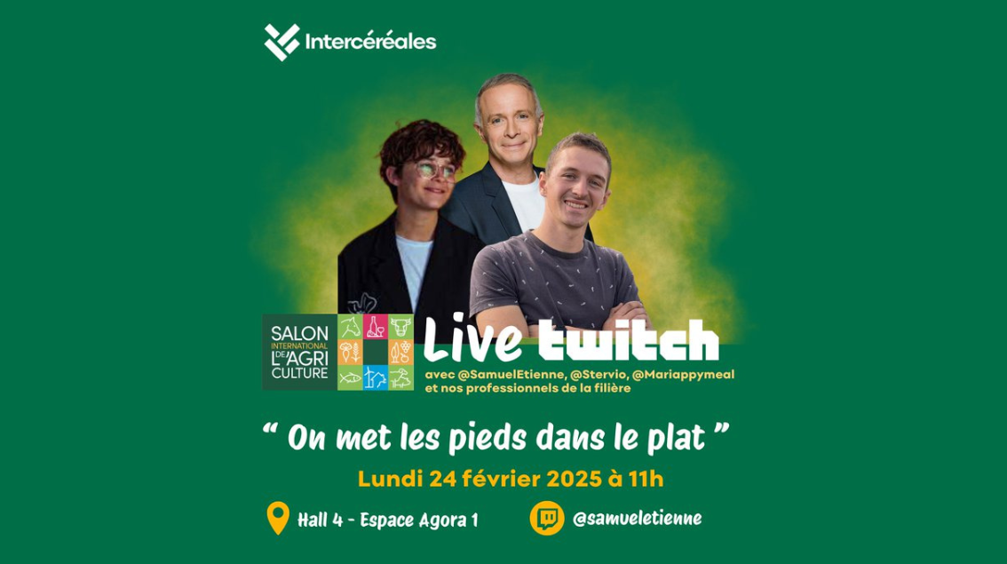 - Le 24 février à 11h, Samuel Etienne, Mariappymeal et Stervio animeront "On met les pieds dans le plat", une émission de 3 heures en direct sur Twitch depuis le Hall 4 du Salon de l'Agriculture 2025. Orchestré par l'association privée Intercéréales (un lobby céréalier français), ce stream vise logiquement à faire la promotion de la filière céréalière française aux 18-35 ans via des discussions avec des agriculteurs et artisans ⤵️