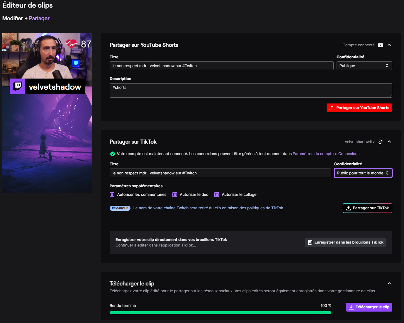 - Il est possible de l'enregistrer dans les brouillons TikTok depuis l'interface Twitch si vous souhaitez poursuivre l'édition depuis votre mobile