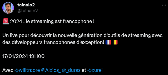 L'outil de la semaine n'en est pas un : il s'agit en fait d'un RDV ! Ce mercredi à 19h00 tapantes, Tainalo2 mettra à l'honneur des développeurs francophones en live sur Twitch et YouTube.