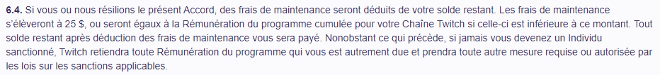 - Vous souhaitez résilier votre contrat d'affilié ou de partenaire ? Il vous en coûtera $25 de "frais de maintenance". La plateforme concurrente Kick n'a pas attendu pour proposer aux streamers qui quitteraient Twitch de prendre en charge ces frais. C'est de bonne guerre...
