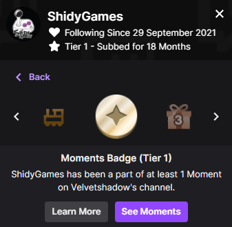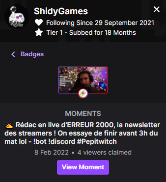 Une fois un Moment validé par un spectateur, celui-ci sera affiché sur sa carte de profil dans le tchat de la chaîne, indiquant le nombre de Moments auquel il a participé, ainsi que les multiples Moments en question en cliquant sur le bouton "Voir les moments". A noter que l'affichage du badge est optionnel : ainsi, vous pouvez tout à fait choisir de rester discret si vous regrettez après coup votre participation à un moment éventuellement gênant... on ne juge pas !