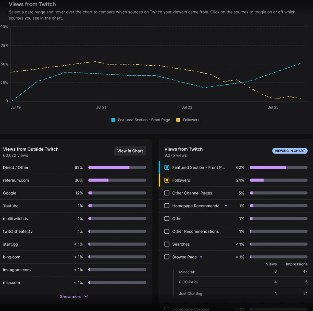 - Graphique "Vues internes à Twitch" : Une nouvelle représentation graphique des vues obtenues depuis Twitch, probablement pour mettre en avant l'un des gros chantiers de 2023, qui est la mise à jour de la découverte de chaînes. Durée du test : 1 mois. ⤵️