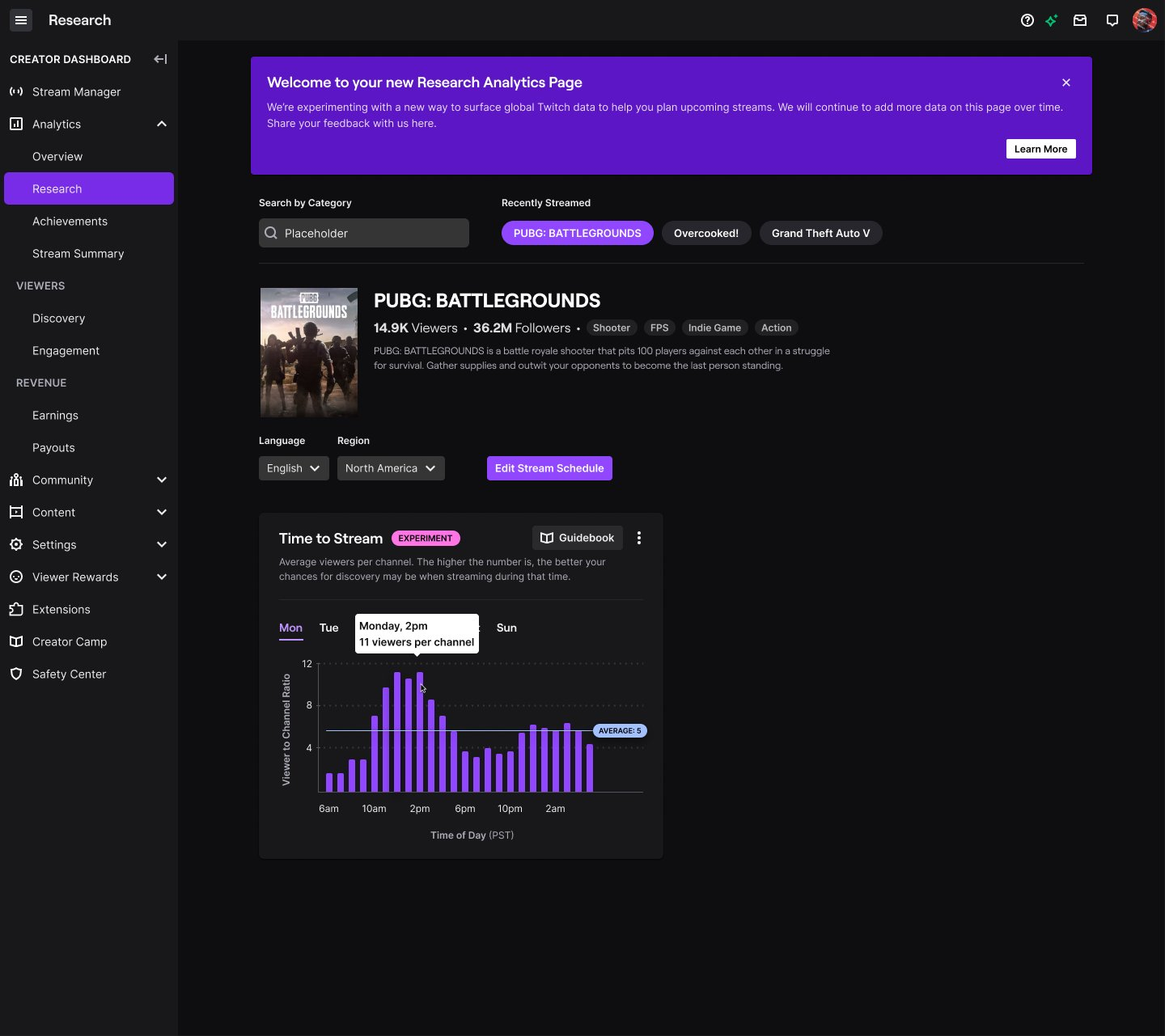 - Page de recherche des statistiques et données sur le temps de stream : Un nouvel onglet "Recherche" vous fournira des données sur vos streams, mais également sur les catégories, avec des filtres par pays et régions. Des informations complémentaires sont prévues, comme par exemple les plages horaires idéales pour toucher votre public cible. Durée du test : 6 semaines. ⤵️