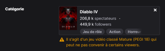 Seulement voilà, Twitch doit trouver de l'argent pronto, alors autant s'aligner sur ce que les annonceurs demandent pour choisir où afficher ou non leurs publicités. Désormais, directement dans les informations à remplir avant chaque live, vous devrez indiquer si votre live comprend les thèmes suivants :