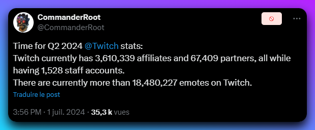 - Il y a ~3,6 millions d'affiliés, 67,4K partenaires et 1,5K comptes "staff" actuellement sur Twitch.