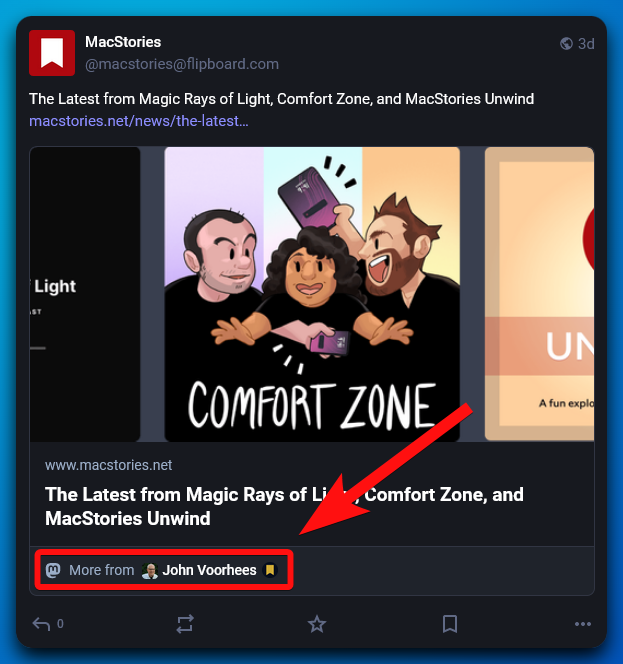 - Mastodon ajoute un moyen pour relier les articles publiés sur le réseau au profil de leurs auteurs. Voici à quoi cela ressemble avec un article de John Voorhees chez MacStories ⤵️