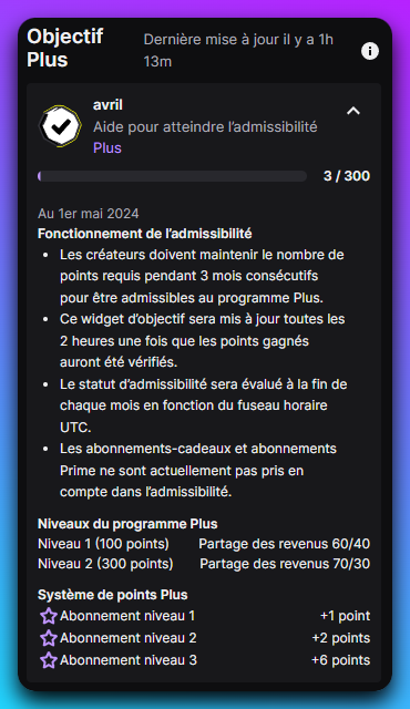 - Twitch essaye une nouvelle mise en avant du programme Plus sur la page des chaînes, juste à droite de la bio (ou en dessous sur mobile). Il s'agit de la jauge de progression mensuelle, accompagnée d'un texte dépliable tentant d'expliquer un peu aux spectateurs de quoi il s'agit (pour activer ce widget sur votre chaîne, il faut vous rendre sur le bouton d'action rapide "Gérer les objectifs" sur votre gestionnaire de stream) ⤵️