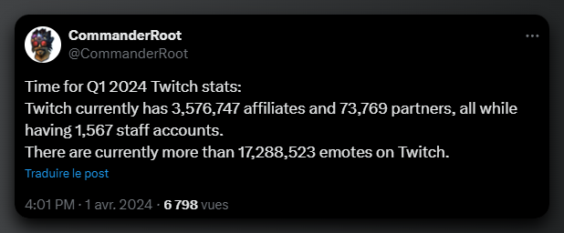 Le fameux exercice trimestriel de récolte de données depuis Twitch de CommanderRoot est 🔗disponible pour le 1er trimestre 2024.