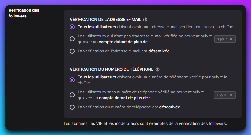 - Modération : il est désormais possible d'empêcher les gens de suivre votre chaîne s'ils n'ont pas un mail et/ou un numéro de téléphone vérifié ⤵️