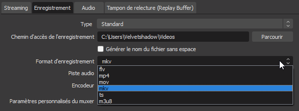En effet, le format MKV n'est pas le plus pratique à utiliser après coup, mais pendant l'enregistrement il a un avantage certain : si votre logiciel plante, tout ce qui a été enregistré jusqu'au moment du plantage est sauvé ! Ce n'est pas le cas pour le format MP4 : en cas de crash, c'est simple : dites adieu à votre enregistrement !