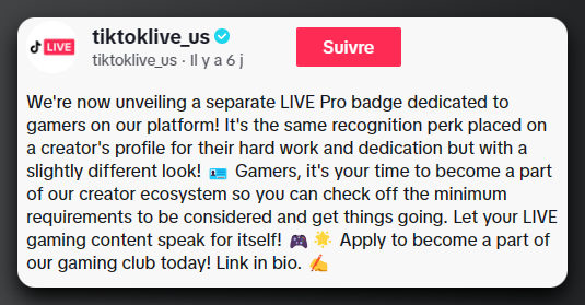 - TikTok lance un nouveau badge LIVE Pro dédié au contenu Gaming sur sa plateforme aux US/Canada, dont voici les critères :