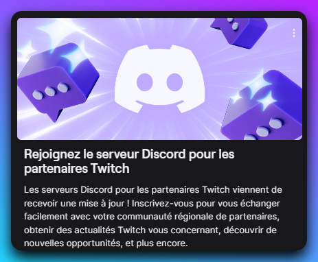 - Twitch met à jour sa stratégie sur Discord. Le serveur dédié aux streamers Partenaires (c'est probablement une surprise pour vous mais oui oui il y avait bel et bien un serveur Discord pour les Partenaires) a été renommé "Twitch NA Partners" (pour "North America"), et de nouveaux serveurs segmentés géographiquement sont apparus ! L'entreprise a communiqué sur son blog sur les raisons de ce rework, et les Partenaires peuvent accéder à leur nouveau serveur régional dédié depuis l'accueil de leur tableau de bord via ce petit pavé ⤵️