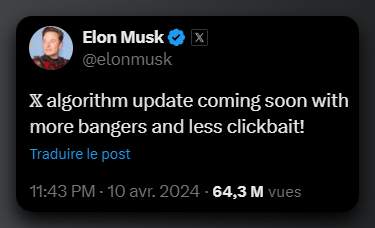 - Le milliardaire a également annoncé une mise à jour de l'algorithme avec "plus de bangers et moins de clickbait" ⤵️