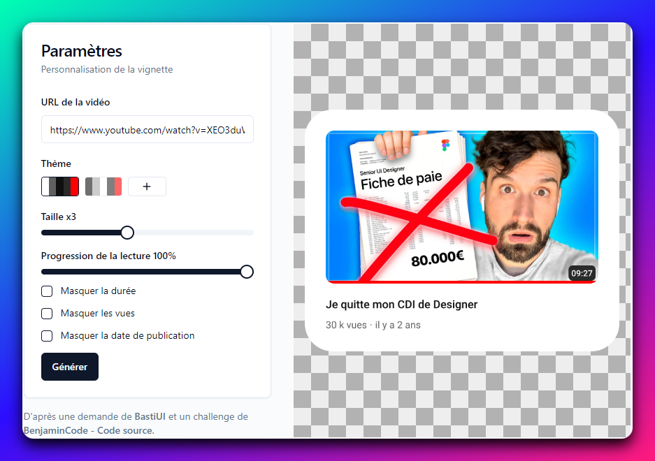 Je suis tombé sur un petit challenge sympathique suite à un échange entre BastiUI et BenjaminCode, qui a donné naissance à de multiples versions d'un outil simple dans sa proposition : générer une carte simple et stylée à partir de l'URL d'un vidéo YouTube ⤵️